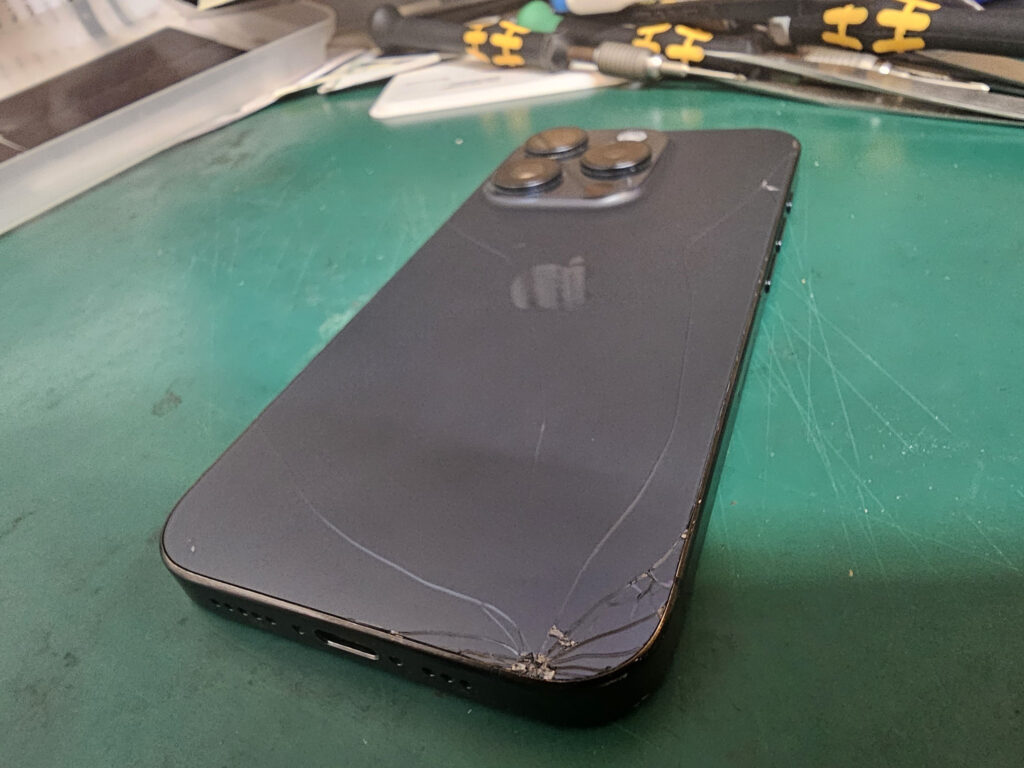 本日の修理ブログは、iPhone15Proの背面ガラス修理を紹介します。 まずは、バックパネルから取り外し交換修理をします。